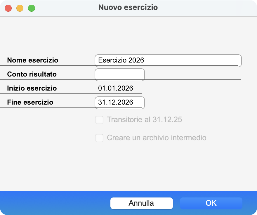 Un esercizio è valido per un anno contabile (di solito dodici mesi). È quindi necessario, alla fine di un anno fiscale, crearne uno nuovo (non è necessario chiudere l'anno fiscale in corso prima di creare quello nuovo). Per farlo si usa il comando File>Nuovo esercizio, in cui appare una finestra in cui si indica il nome del nuovo anno fiscale, il numero di conto economico e le date di inizio e fine dell'anno fiscale. Nel campo Conto risultato, specificare il numero del conto che riceve la differenza tra tutti i conti attivi e i conti passivi in modo che i saldi iniziali del nuovo anno siano bilanciati.