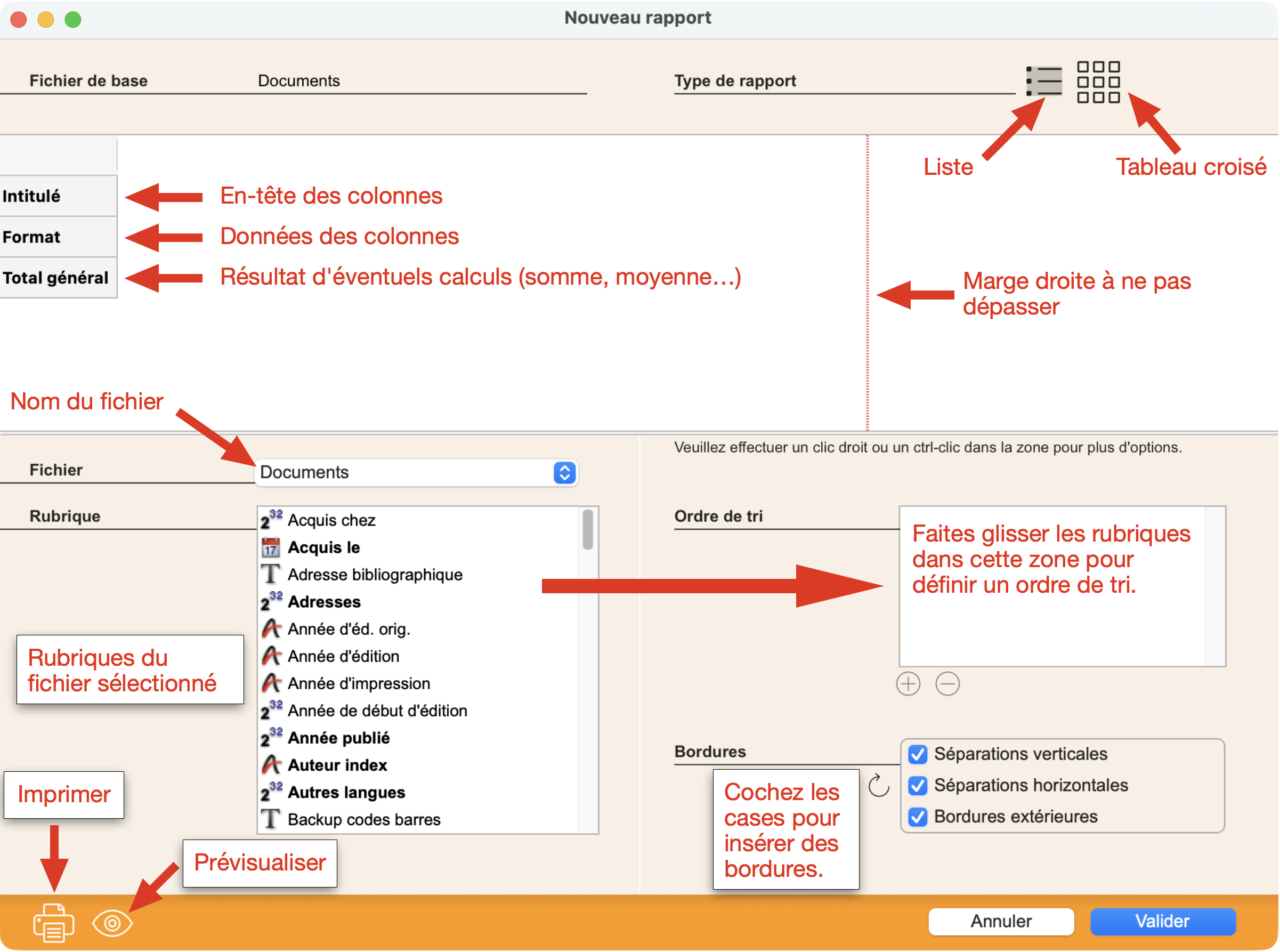 Le Fichier de base, que vous avez choisi avant d’accéder au générateur de rapports, est rappelé en haut à gauche.