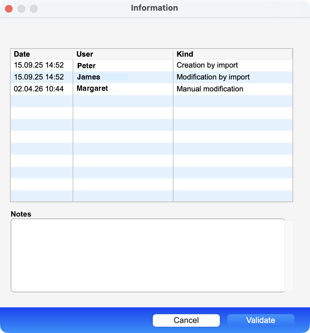 This window also shows you the dates on which the file was created and modified, as recorded in the fields Entry date and Modification date. You can also see the name of the users who modified the record.