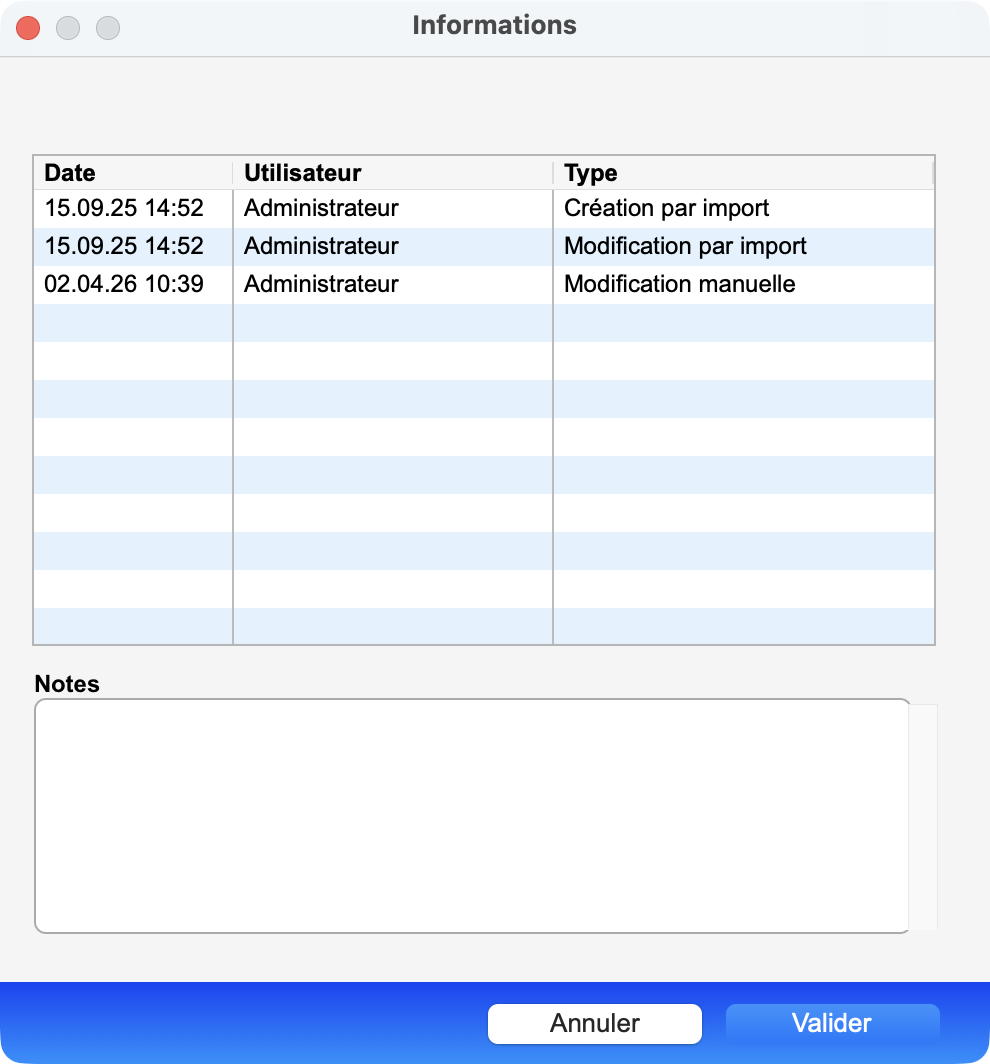 Cette fenêtre vous renseigne aussi sur les dates de création et jusqu'aux 10 dernières modification de la fiche, enregistrées dans les rubriques Date saisie et Date modification. Vous pouvez de plus connaître le nom des utilisateurs qui ont modifié la fiche.