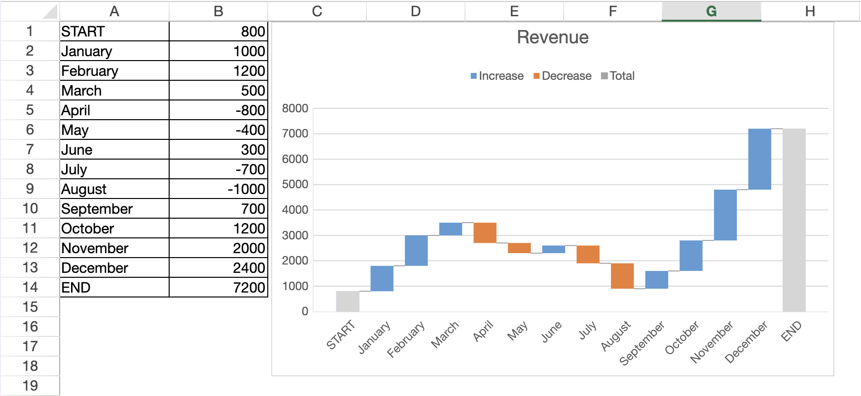 A new chart type called “Waterfall” is available. This chart type is particularly useful for displaying an initial value, intermediate values, and a final value, such as sales over time. |