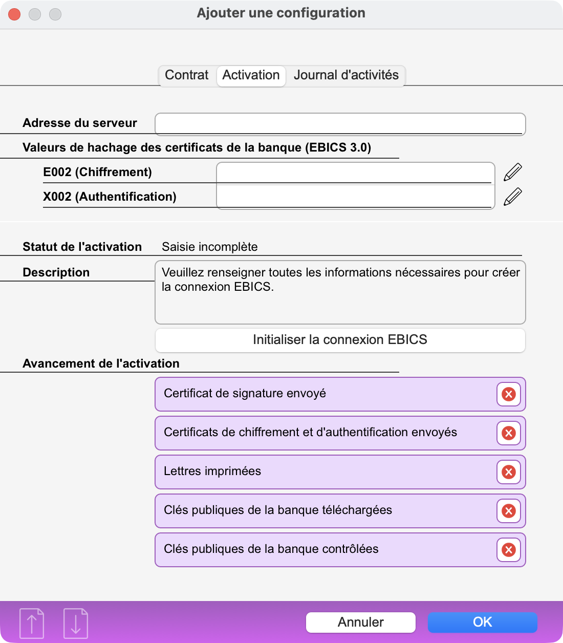 Adresse du serveur : adresse du serveur EBICS à la banque Valeurs de hachage des certificats de la banque (EBICS 3.0) E002 (chiffrement) : données fournies par la banque X002 (authentification) : données fournies par la banque Statut de l'activation et Description : le programme vous informe si le protocole EBICS peut être utilisé ou non en fonction de l'état d'avancement des étapes préparatoires. Avancement de l'activation : le programme affiche l'état d'avancement des étapes préparatoires. Une étape franchie est marquée d'un √ en vert. |