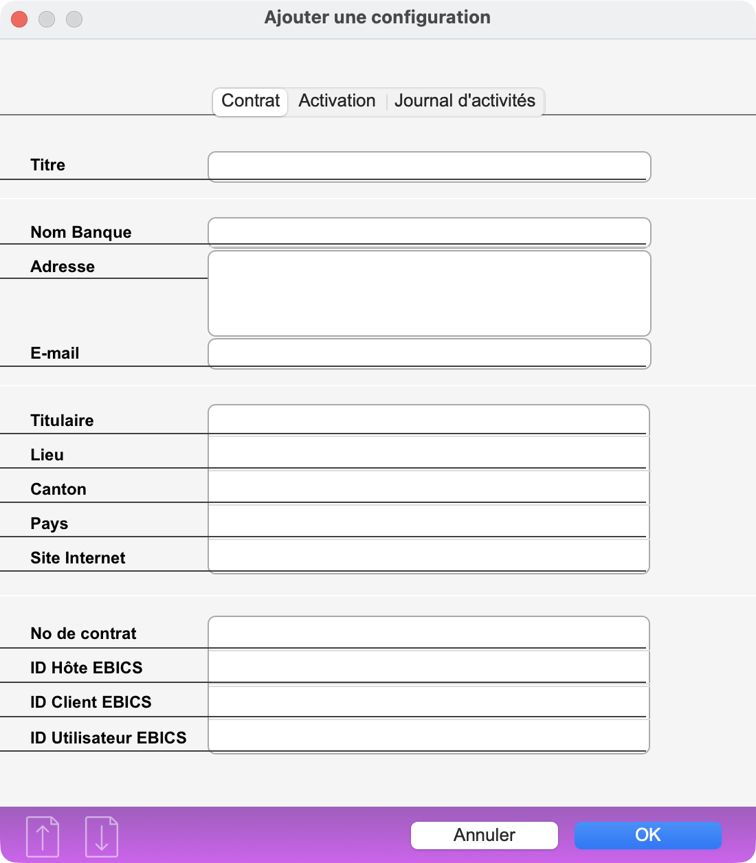 Dans le menu Opérations, appelez la commande Configurer EBICS et créez une configuration. Si vous disposez de plusieurs comptes à la même banque, celle-ci vous indiquera s'il faut conclure plusieurs contrats, donc créer plusieurs configurations, ou une seule. Si vous disposez de comptes dans plusieurs banques, il faudra créer plusieurs configurations distinctes.