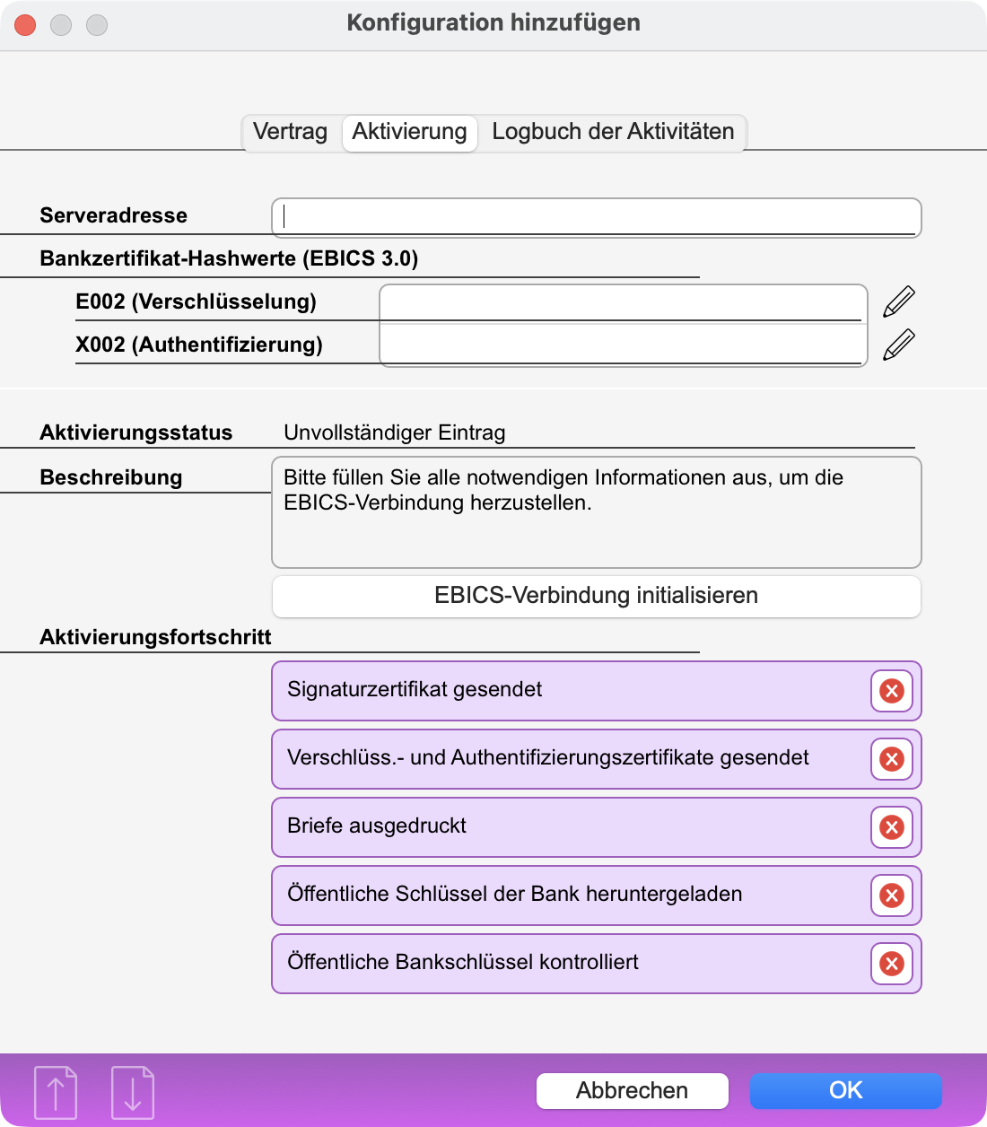 Serveradresse : EBICS-Serveradresse bei der Bank Bankzertifikat-Hashwerte (EBICS 3.0) E002 (Verschlüsselung) : Daten durch die Bank übermittelt X002 (Verschlüsselung) : Daten durch die Bank übermittelt Aktivierungsstatus und Beschreibung : Das Programm informiert Sie darüber, ob das EBICS-Protokoll je nach Fortschritt der Vorbereitungsschritte verwendet werden kann oder nicht. Aktivierungsfortschritt : Das Programm zeigt den Fortschritt der Vorbereitungsschritte an. Ein abgeschlossener Schritt wird mit einem grünen √ markiert. |
