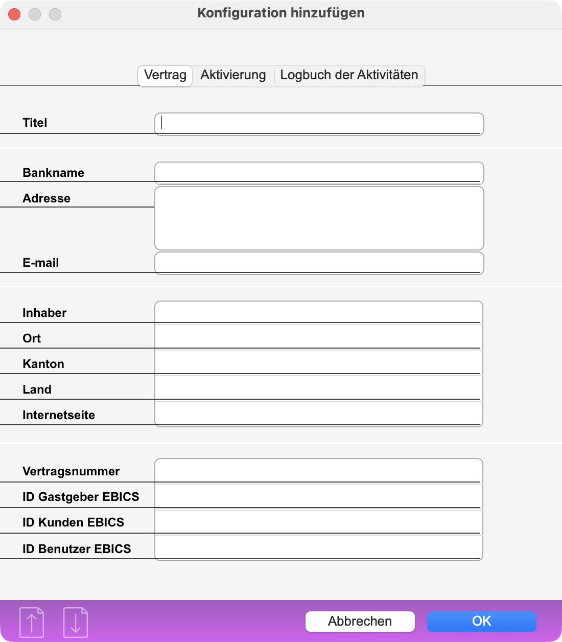 Rufen Sie im Menü Operationen den Befehl EBICS konfigurieren auf und erstellen Sie eine Konfiguration. Wenn Sie mehrere Konten bei derselben Bank haben, wird Ihnen diese mitteilen, ob Sie mehrere Verträge abschliessen und somit mehrere Konfigurationen erstellen müssen oder nur einen einzigen. Wenn Sie Konten bei mehreren Banken haben, müssen Sie mehrere separate Konfigurationen erstellen.