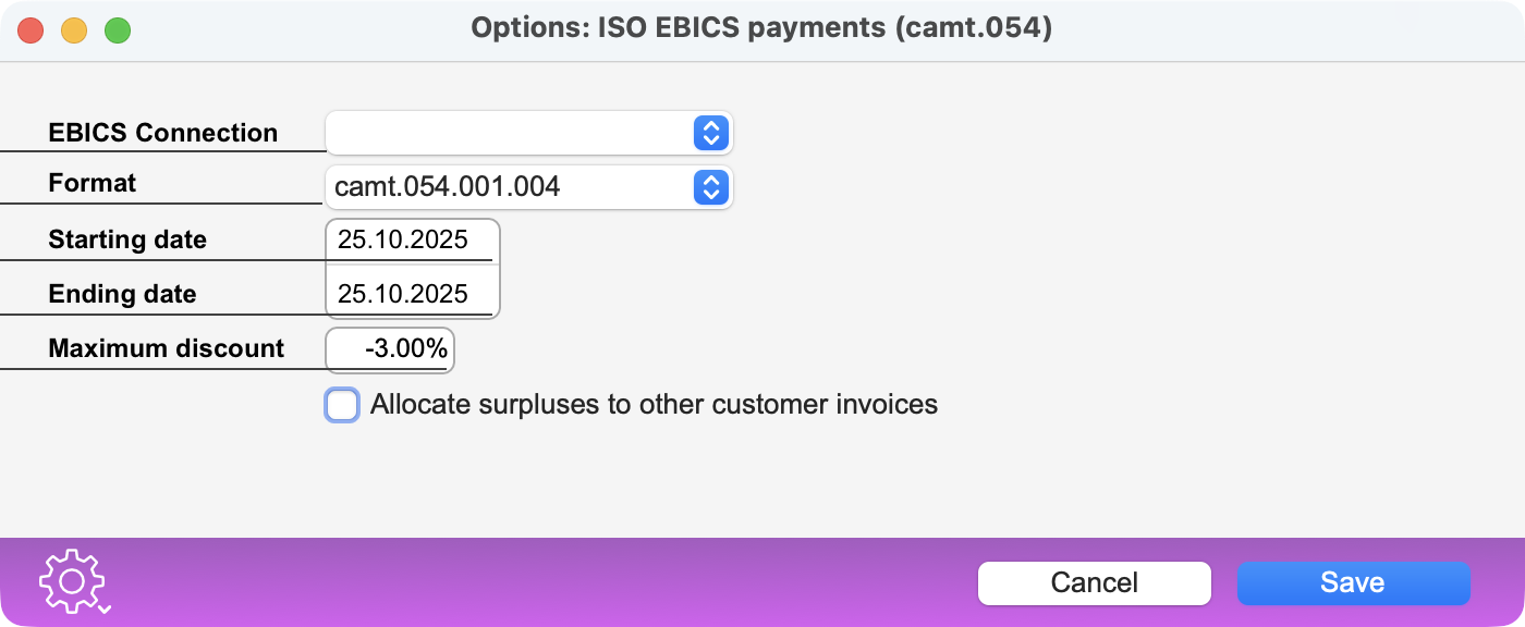 EBICS Connection : Select the desired configuration. If you have created several different configurations because you have multiple accounts, you can duplicate the import format so that each format corresponds to a different bank account. Format : Select one of the values offered: camt.054.001.004 or camt.054.001.008. Your bank will provide you with information on the supported format. Starting date and Ending date : Set the date range to import payments made only during the specified period. Maximum discount : Set the maximum discount allowed for the invoice to be considered paid. Allocate surpluses to other customer invoices : Check this box so that if a payment exceeds the amount of the invoices sent to the customer, the surplus is used to settle (partially or completely) other outstanding invoices. |