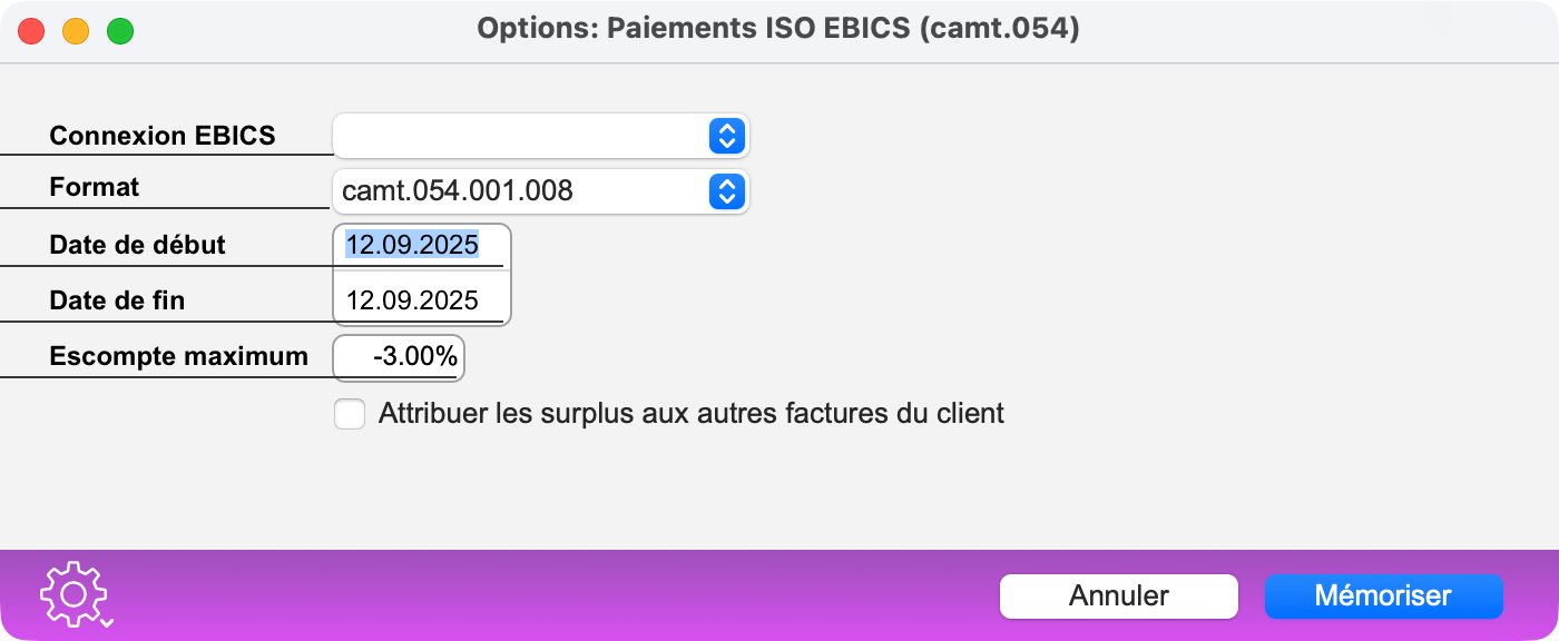 Les différentes options sont les suivantes : Connexion EBICS : sélectionnez la configuration désirée. Si vous avez créé plusieurs configurations différentes car vous disposez de plusieurs comptes, vous pouvez dupliquer le format d'import afin que chaque format corresponde à un compte bancaire différent. Format : choisissez l'une des valeurs proposées camt.054.001.004 ou camt.054.001.008. Votre banque vous renseignera sur le format supporté. Date de début et Date de fin : définissez la fourchette de dates pour importer les versements effectués uniquement pendant la période spécifiée. Escompte maximum : fixez l'escompte maximum autorisé pour considérer la facture comme soldée. Attribuer les surplus aux autres factures du client : cochez cette case pour qu'en cas de versement supérieur au montant des factures adressées au client, le surplus soit utilisé pour solder (partiellement ou complètement) d'autres factures ouvertes. |