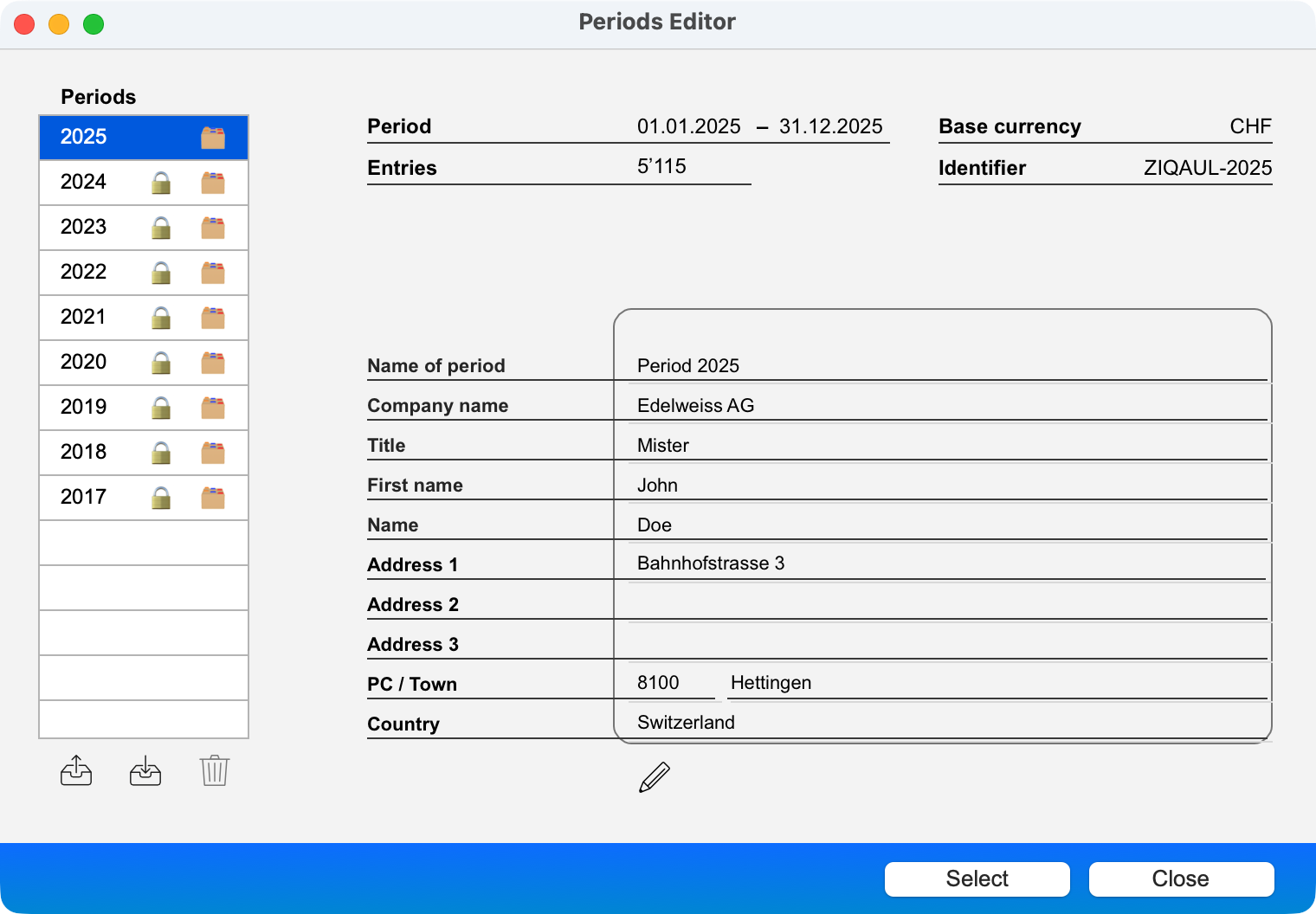 - Switch the current period (select the desired period from the list on the left and click the Select button). Please note that you can also switch the period by using the pop-up menu at the bottom right of the main window.