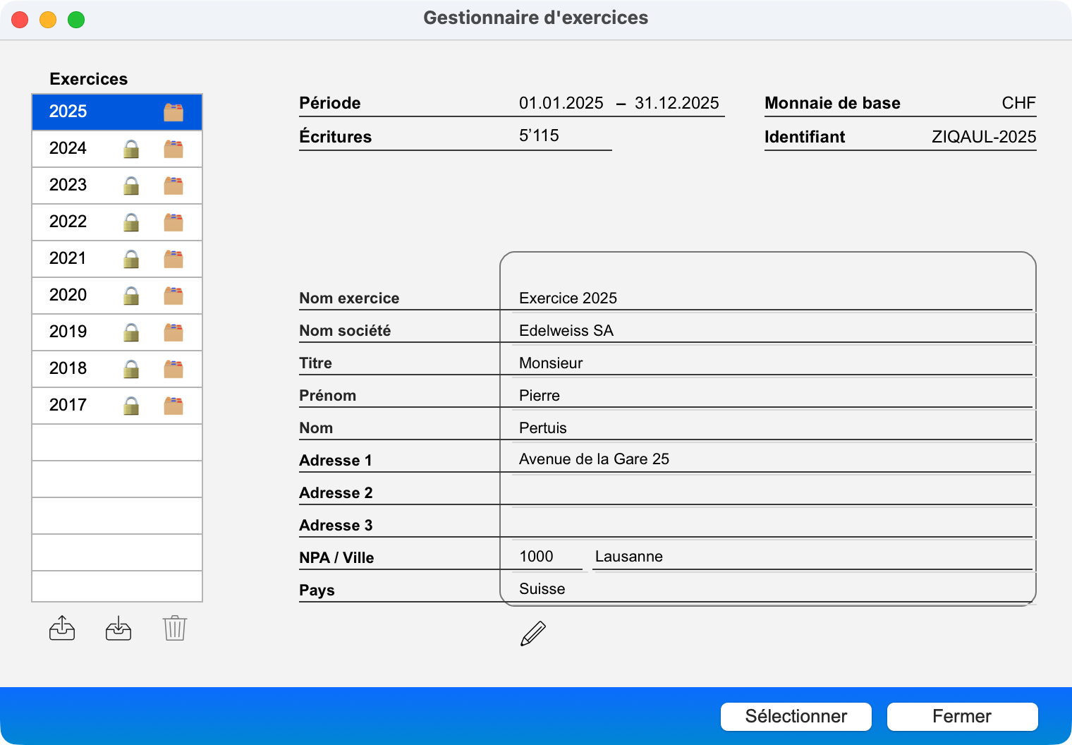 - A gauche, une liste des exercices enregistrés dans le fichier de données. Chaque exercice est représenté par son année et peut être accompagné d'une icône de cadenas pour indiquer que l'exercice est verrouillé et d'une icône de dossier pour indiquer que l'exercice a été archivé.