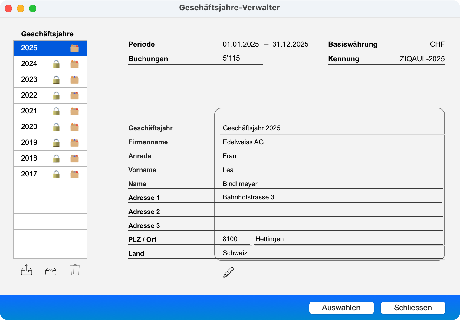 - Aktuelles Geschäftsjahr wechseln (wählen Sie aus der Liste links das gewünschte Geschäftsjahr aus und klicken Sie auf die Schaltfläche Auswählen). Beachten Sie, dass Sie das Geschäftsjahr auch über das Popup-Menü unten rechts im Hauptfenster wechseln können.