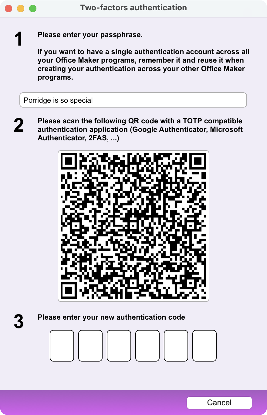 *If the user logs into multiple Office Maker programs, it will be easier to enter the same phrase in each program so that there is only one entry in the TOTP app.