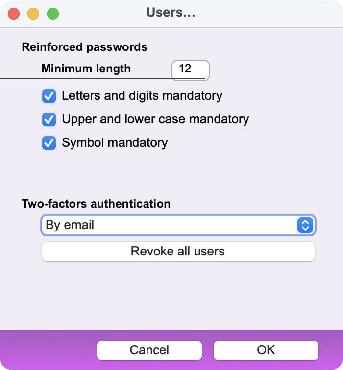 You enable two-factors authentication by selecting Configure Users from the Maintenance menu and then clicking the Options button. You get the following dialog box: