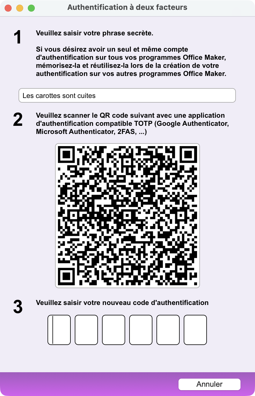 *Si l'utilisateur se connecte à plusieurs programmes Office Maker, il sera plus simple de saisir la même phrase dans chaque programme afin de n'avoir qu'une seule entrée dans l'app TOTP.