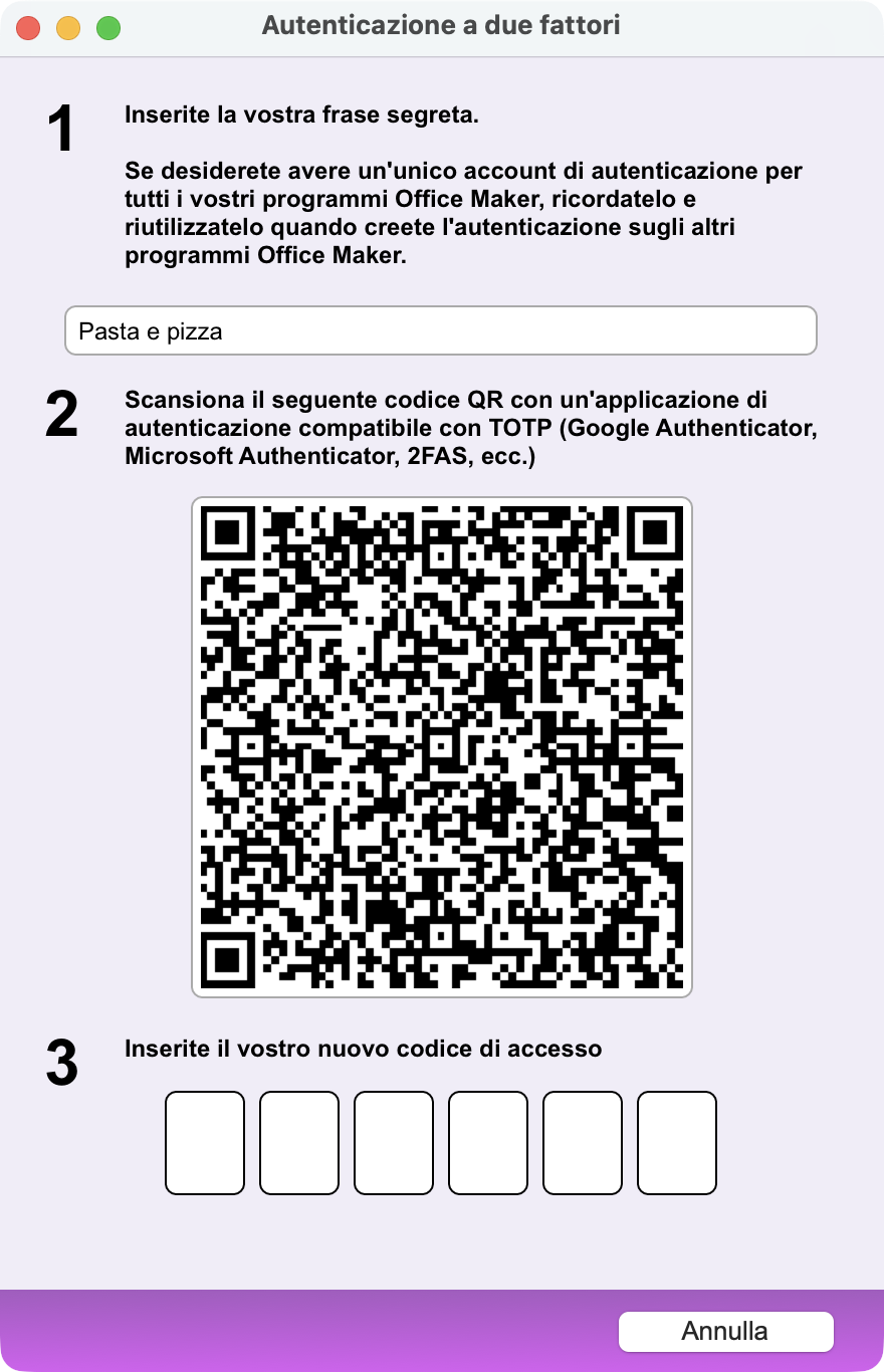 *Se l'utente accede a più programmi Office Maker, sarà più semplice inserire la stessa frase in ogni programma in modo da avere una unica voce nell'app TOTP.