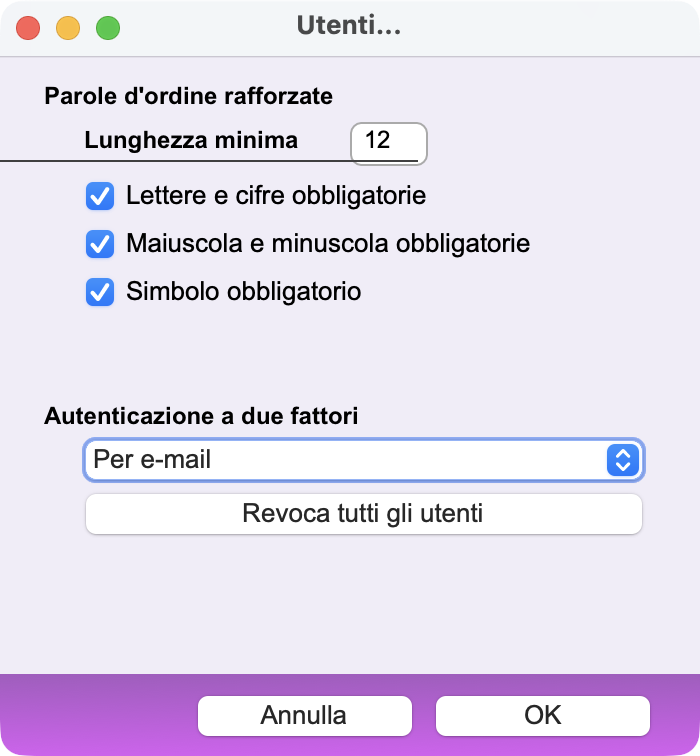 È possibile attivare la doppia autenticazione richiamando il comando Configura utenti dal menu Mantenimento e facendo clic sul pulsante Opzioni. Viene visualizzata la seguente finestra di dialogo:
