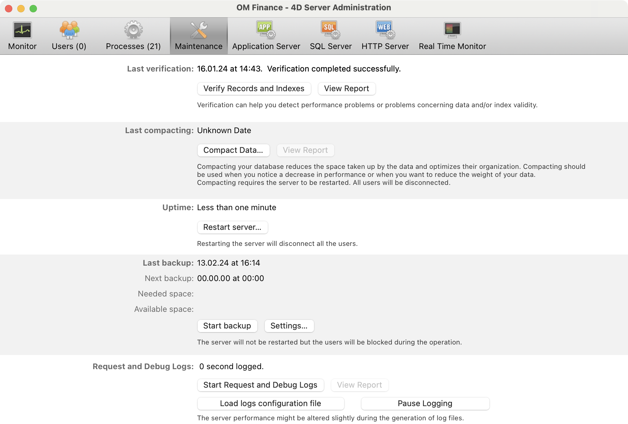 Then click on the Compact Data… button: the program displays the same dialog box as when you exit the program. This is because compacting involves restarting the program in Maintenance mode, requiring all users to log out of the server.