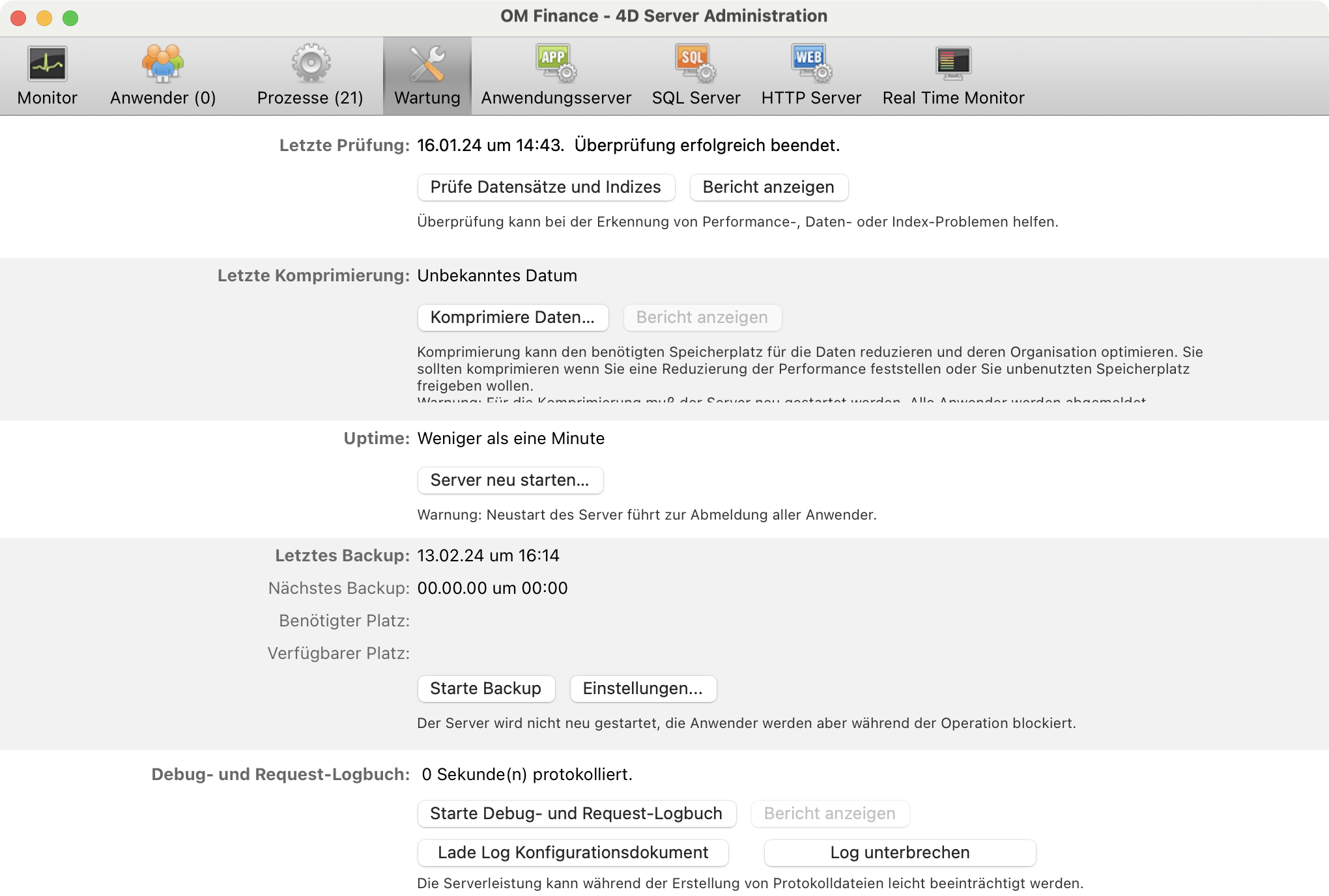 Die Komprimierung erfolgt über das Verwaltungsfenster der Serveranwendung. Wenn diese Anwendung unter Windows im Dienstmodus läuft, beenden Sie den Dienst und starten Sie die Anwendung manuell über den Windows Explorer oder das Startmenü.
