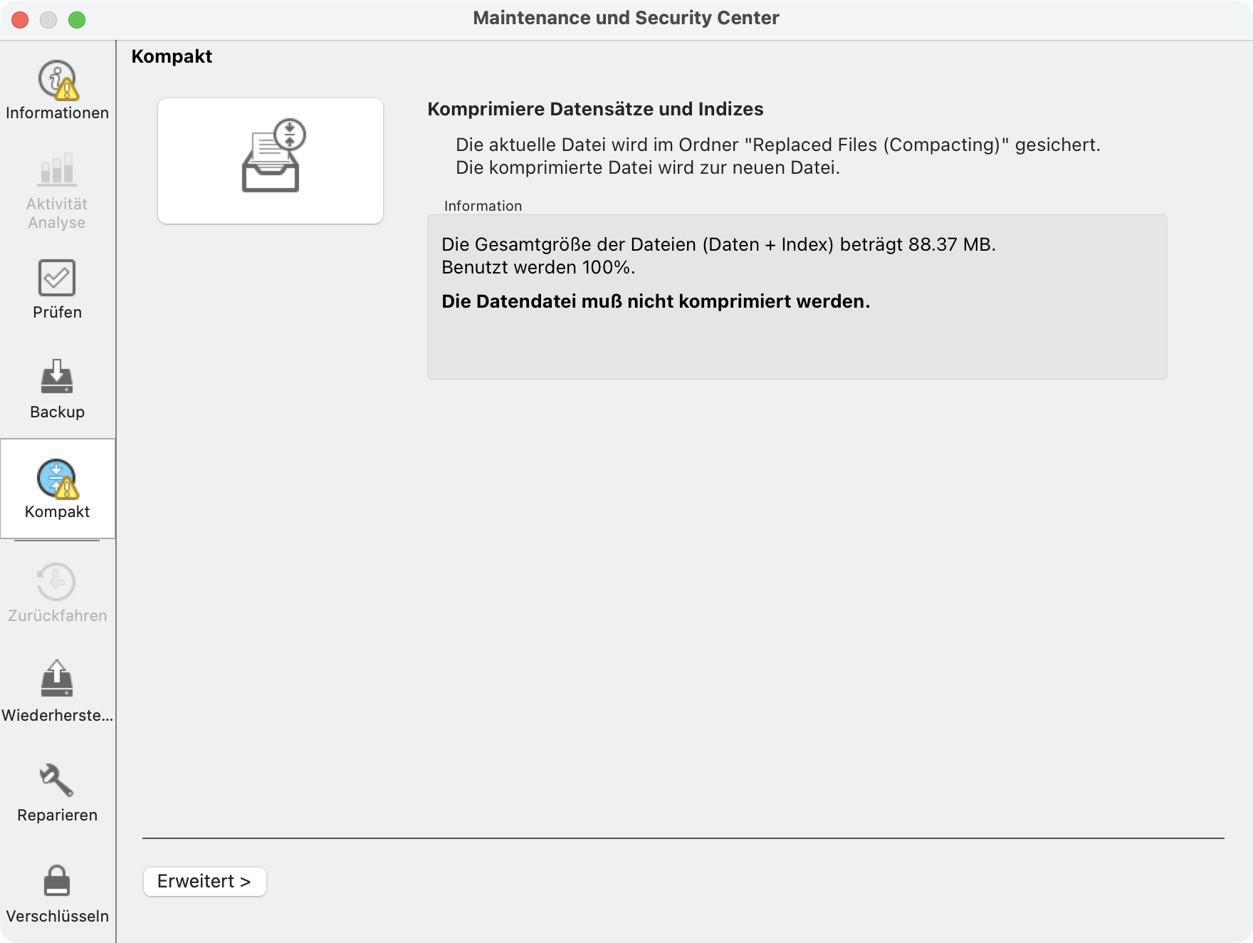 Klicken Sie anschliessend in der linken Seitenleiste auf die Registerkarte Kompakt. Im oberen Bereich des Fensters zeigt das Programm die Auslastung der Daten in der Datei an. Je höher die Auslastung, desto besser ist die Datenauslastung. Das Programm zeigt Ihnen an, ob eine Komprimierung empfohlen wird oder nicht erforderlich ist.