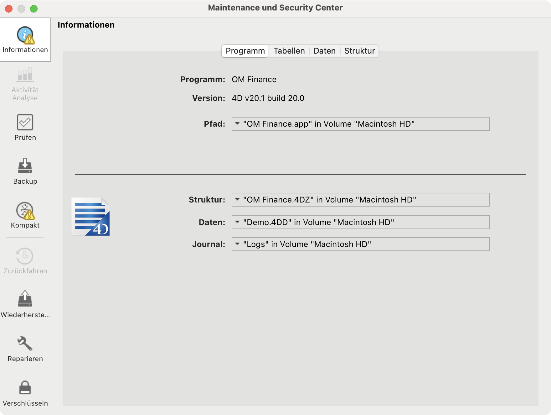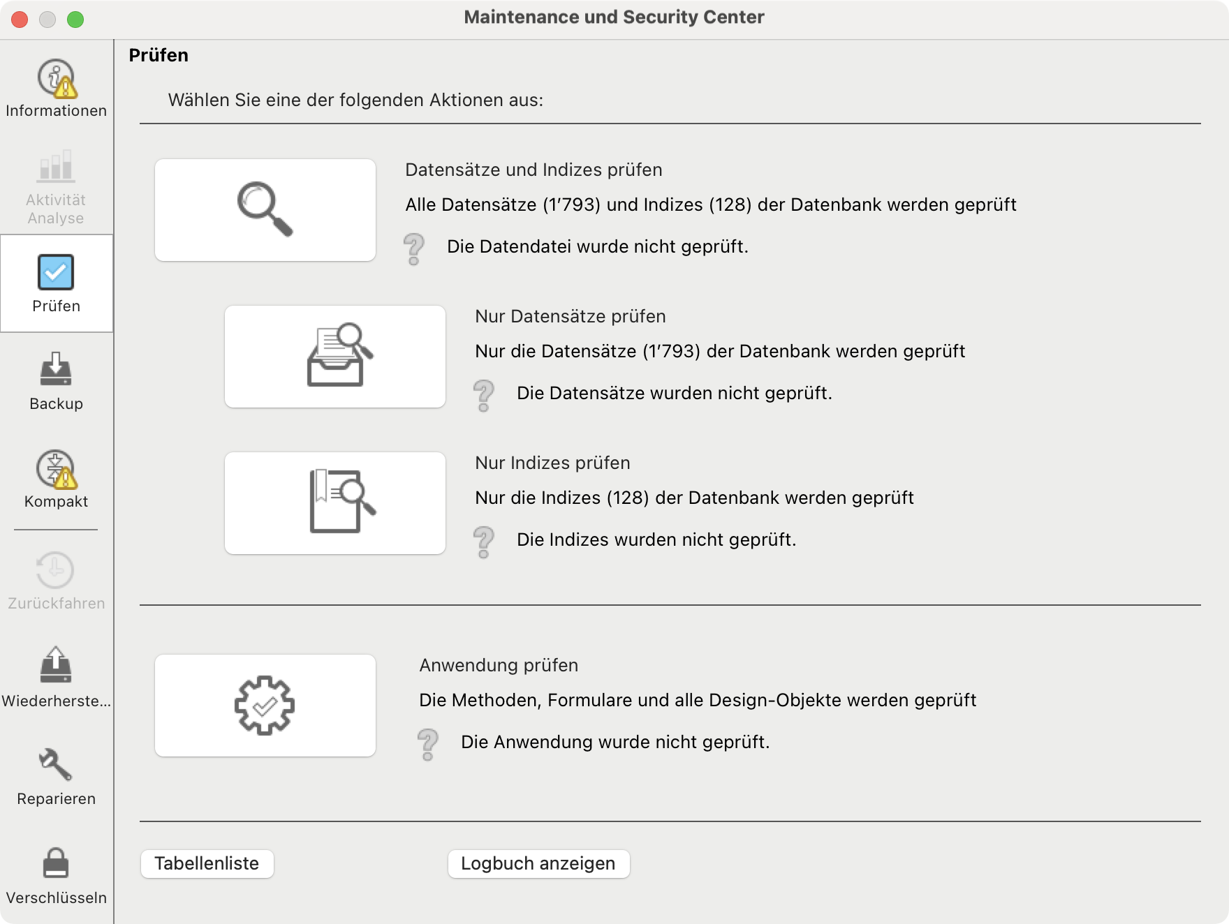 Wir empfehlen Ihnen, zuvor zu überprüfen, ob Ihre Datendatei beschädigt ist. Klicken Sie in der linken Seitenleiste auf die Registerkarte Prüfen und dann oben links auf die Schaltfläche „Lupe”. Wenn Anomalien festgestellt werden, klicken Sie auf die Schaltfläche Logbuch anzeigen, um weitere Informationen zu erhalten.