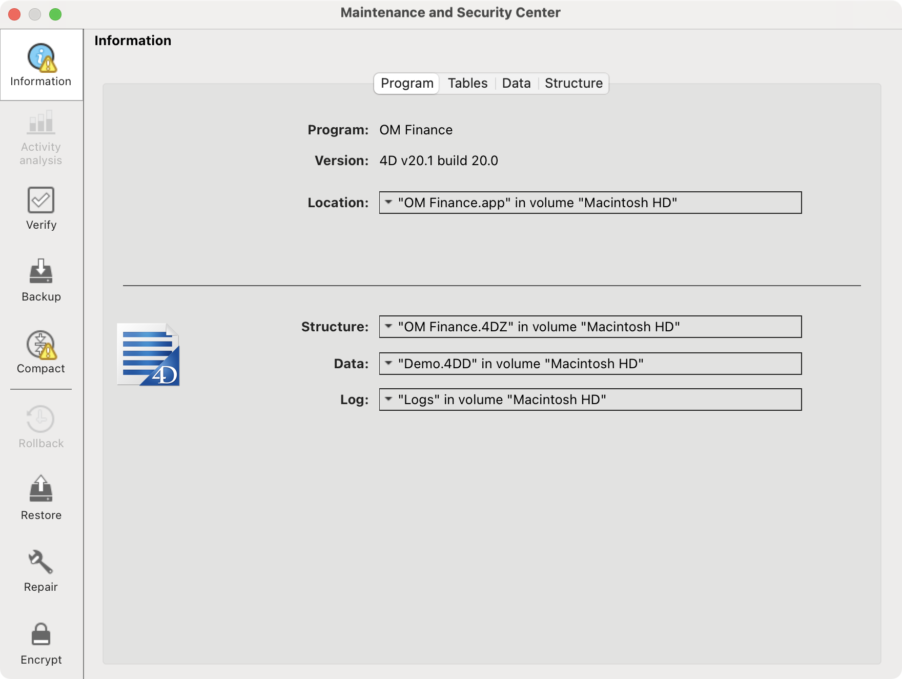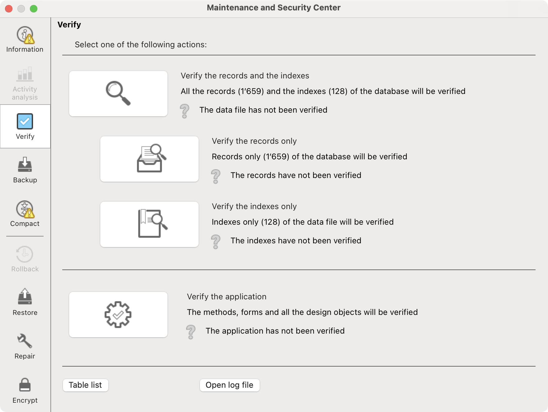 Vi consigliamo di verificare preventivamente che il vostro file di dati non sia danneggiato. Cliccate sulla scheda Verify nella barra laterale sinistra, quindi sul pulsante “Lente di ingrandimento” in alto a sinistra. Se vengono rilevate anomalie, clicca sul pulsante Open log file per ulteriori informazioni.