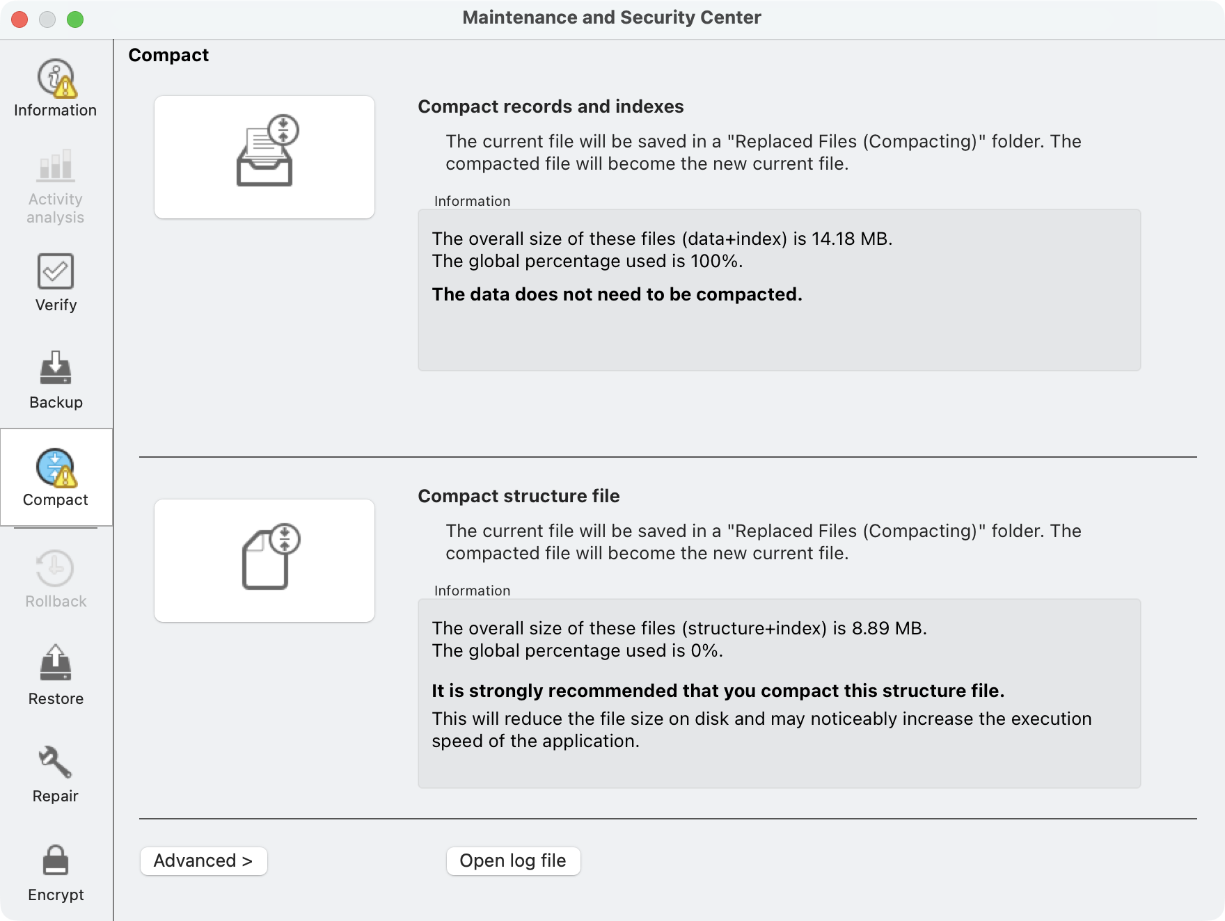 Il pulsante Open log file consente di accedere a un rapporto sulla compattazione.