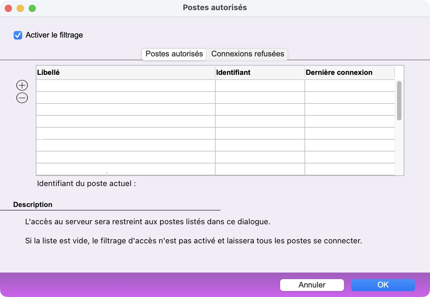 Un tableau liste les connexions qui ont été refusées. Si vous souhaitez autoriser un des postes de la liste, sélectionnez-le puis cliquez sur le bouton + pour l'ajouter à la liste des postes autorisés.