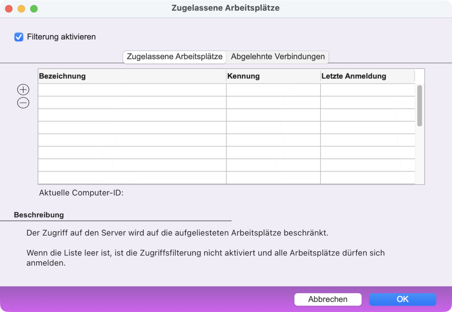 In einer Tabelle werden die abgelehnten Verbindungen aufgelistet. Wenn Sie einen der Rechner in der Liste zulassen möchten, wählen Sie ihn aus und klicken Sie auf die Schaltfläche +, um ihn zur Liste der zugelassenen Rechner hinzuzufügen.