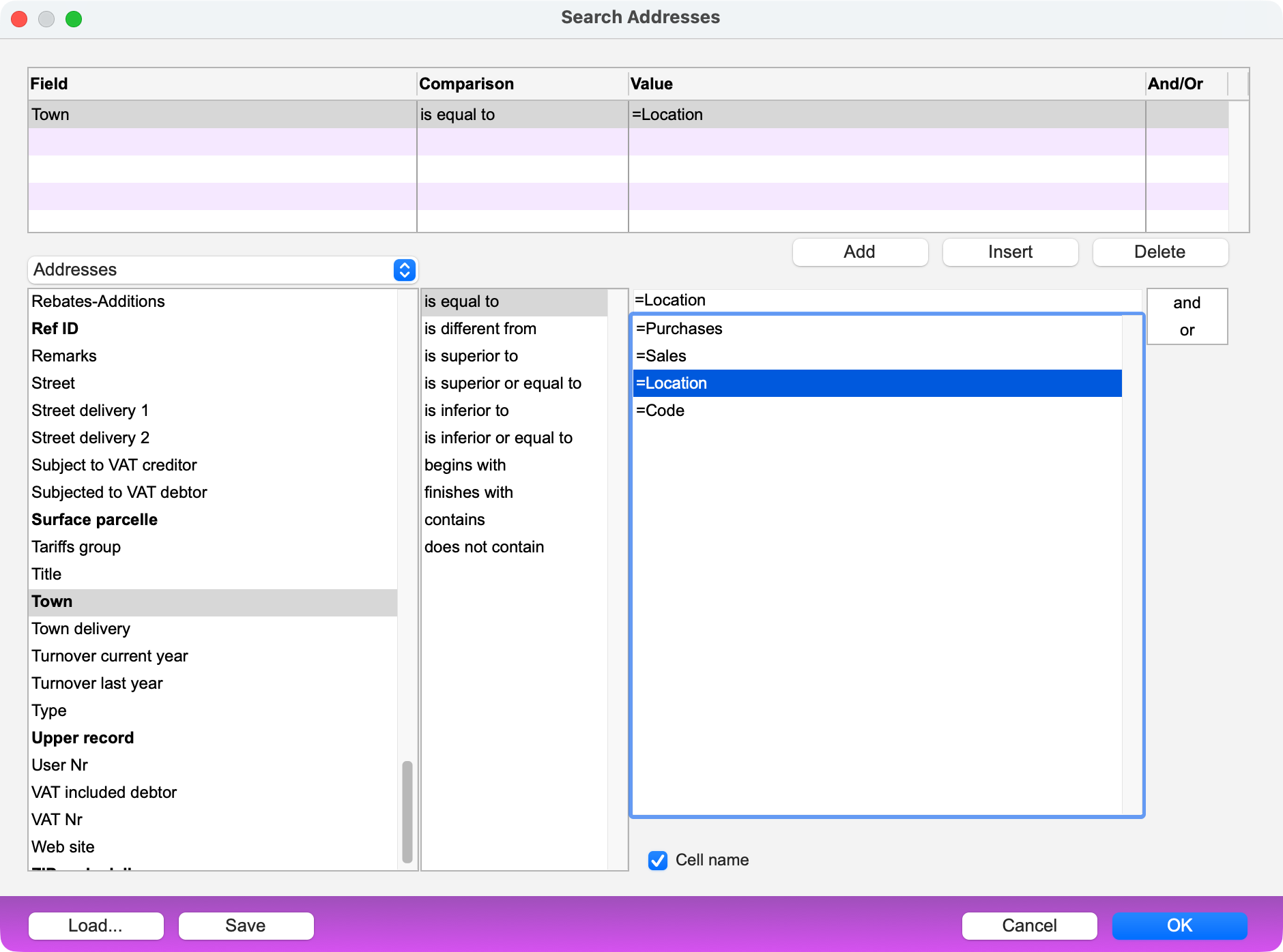- Search button: displays the search formula editor. If you check the Cell Name checkbox, a list of all named cells will be displayed.