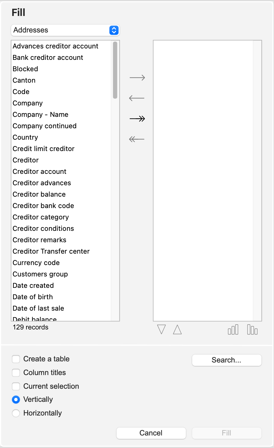 - At the top right, an area displaying the selected fields. Use the arrow buttons located between the two areas to add or remove fields.