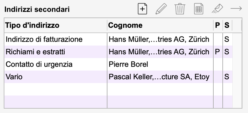 Il collegamento tra una scheda Indirizzo e gli indirizzi secondari viene gestito nella pagina Indirizzo della scheda Indirizzo. Una barra di scorrimento contiene una riga per ogni indirizzo secondario collegato.