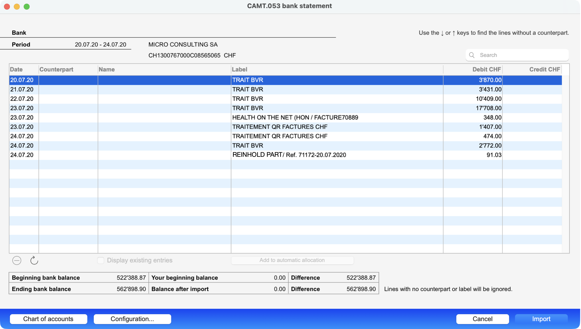 Note: Only lines containing a counterpart and a description will be imported.