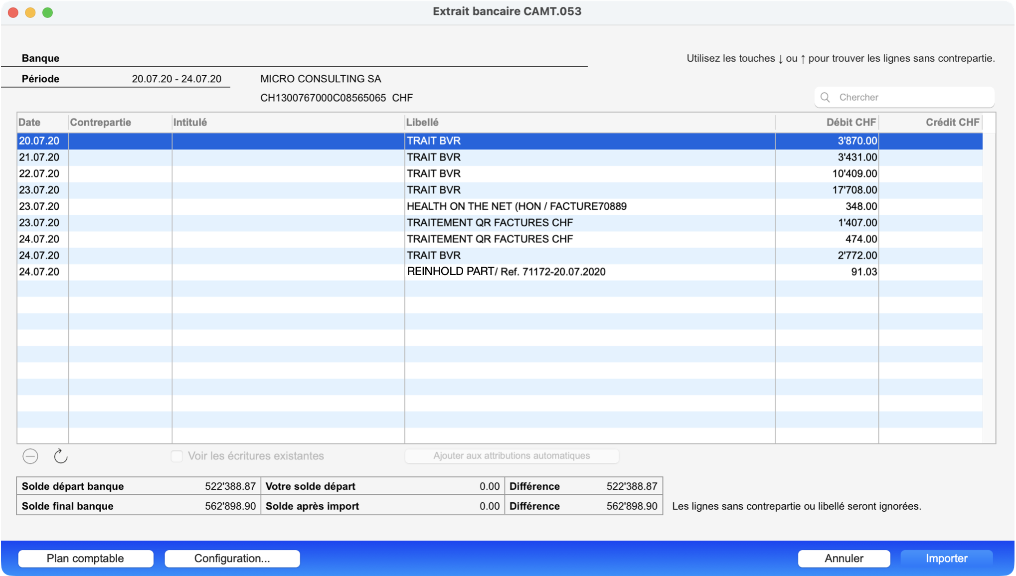 Remarque : seules les lignes contenant une contrepartie et un libellé seront importées.