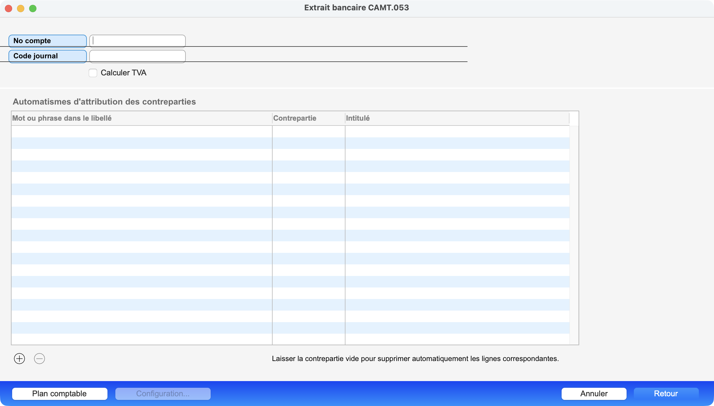 | Automatisme d'attribution des contreparties | Saisissez dans ce tableau des mots ou des expressions, qui - si trouvé(e)s à l'intérieur les libellés des lignes - attribueront automatiquement aux mouvements la contrepartie définie. Si vous laissez la contrepartie vide, les mouvements concernés seront masqués lors de l'import. Ainsi, si vous définissez par exemple le mot "QR" sans contrepartie, aucun mouvement contenant cette abréviation ne sera présenté. Vous ajoutez des entrées à la liste avec le bouton "+" au bas de la liste ou avec le bouton Ajouter aux attributions automatiques du dialogue principal. Supprimez des entrées avec le bouton "-". Ces automatismes sont conservés pour la fois suivante. Vous pouvez à tout moment réappliquer les automatismes sur les lignes n'ayant pas encore de contrepartie avec le bouton "flèche circulaire". Passez rapidement de la liste des écritures à la configuration avec les raccourcis clavier Cmd/Ctrl flèche droite et gauche. |
