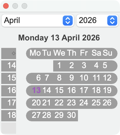 Un clic sur ce bouton a pour effet d'afficher une petite fenêtre contenant un mini-calendrier destiné à sélectionner rapidement les événements par date. Depuis ce calendrier, il est possible de choisir l’année, le mois, la semaine ou le jour pour lesquels on souhaite visualiser les Événements. Pour sélectionner une semaine entière, cliquez sur le numéro de la semaine, dans la première colonne. Pour sélectionner tous les mardi du mois, cliquez sur le nom du jour dans la première ligne. |