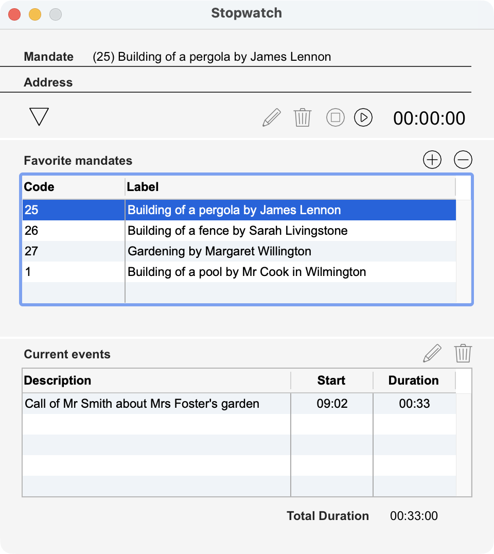 This dialog lets you measure the time used for a mandate. Select the mandate you are working on then start the stopwatch. When finished, stop the stopwatch: an Event record is created, displayed in the Current events area. This record is filled with by default values: Start date and time, End date and time, duration, address code linked to the mandate, employee linked to the current user account. By clicking on the pencil button, you can edit the Event record. If necessary, delete the event with the trash button. Mandate: Chosen mandate for which the time will be measured. Address: Contact person linked to the mandate. Stopwatch: start the stopwatch with the Play button and stop it with the Stop button. Favorites Mandates: list of current mandates. Edit this list with the + and - buttons Current events: list of the events of the days linked to mandates. Total duration: total time used today for mandates.