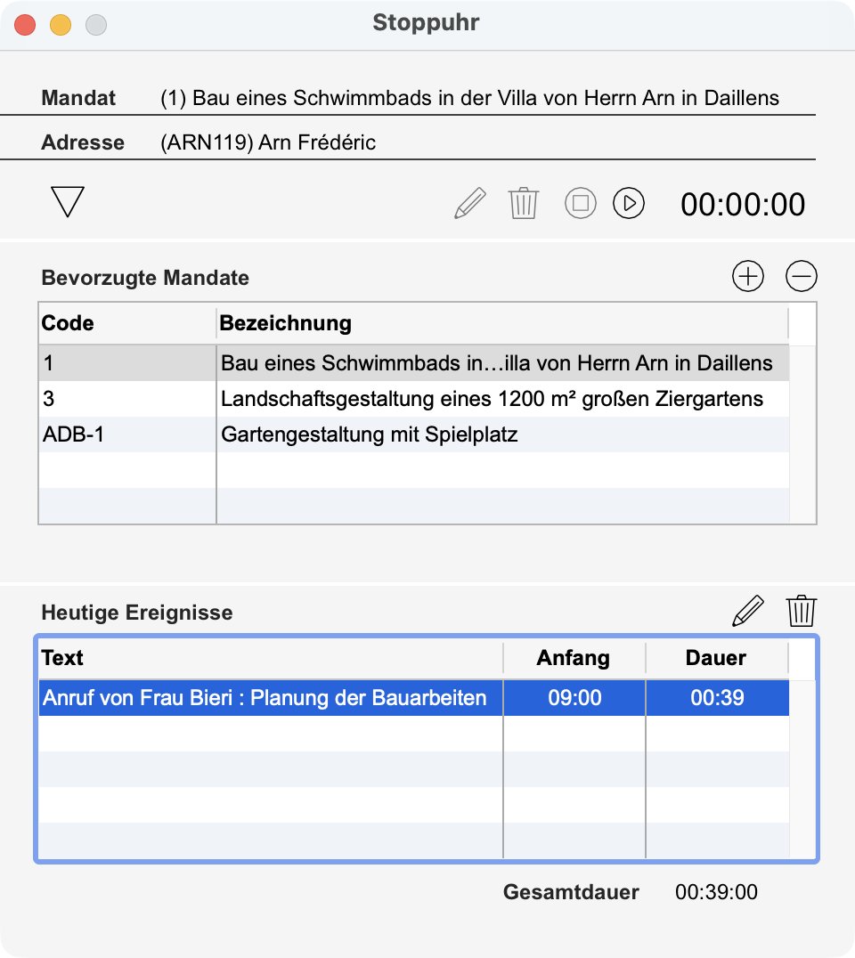 Sie registrieren in diesem Dialog die nötige Zeit für die Verwaltung eines Mandats. Wählen Sie das gewünschte Mandat, dann starten Sie die Stoppuhr. Wenn Sie fertig sind, stoppen Sie die Stoppuhr: Eine Ereignisaufnhame wird erstellt, die im Bereich Heutige Ereignisse erscheint. Diese Aufnahme enthält automatisch Standardwerte wie das Anfangsdatum und die Zeit, das Enddatum und die Zeit, die Dauer, den Code der mit dem Mandat verbundenen Adresse und den Mitarbeiter, der mit dem aktuellen Benutzer verknüpft ist. Ergänzen Sie die Ereignisaufnahme mit der Schaltfläche "Bleistift". Falls nötig löschen Sie das Ereignis mit der Schaltfläche "Papierkorb". Mandat: Die gemessene Zeit wird mit dem ausgewählten Mandat verknüpft. Adresse: Kontaktperson, die mit dem Mandat verknüpft ist. Stoppuhr: starten Sie die Stoppuhr mit der Schaltfläche "Play" und stoppen Sie sie mit der Schaltfläche "Stopp". Bevorzugte Mandate: Liste der offenen Mandate. Sie bearbeiten diese Liste mit den Schaltflächen + und -. Heutige Ereignisse: Liste der heutigen Ereignisse, die mit Mandaten verknüpft sind. Gesamtdauer: Gesamtdauer der heutigen Zeitbenutzung.
