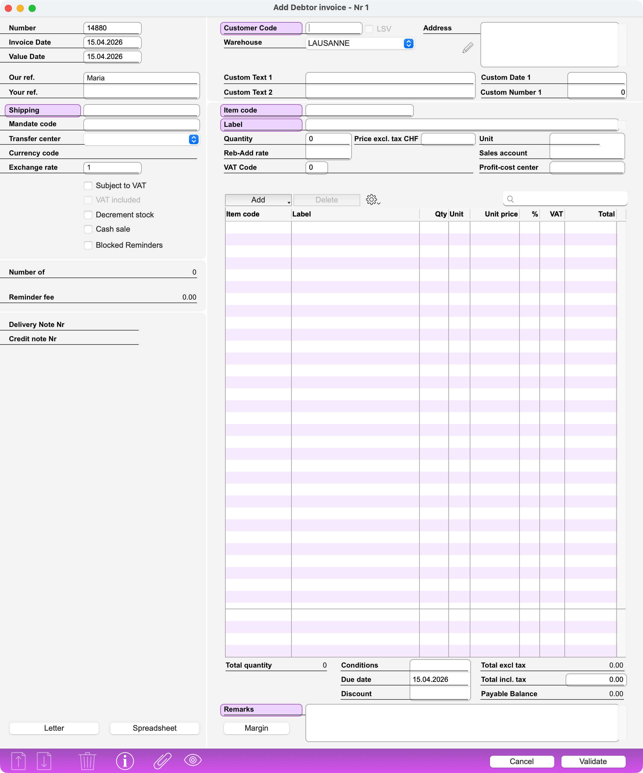 Total amount of the document, including VAT where applicable, and taking into account the various discounts and surcharges applied. This amount may be modified (e.g. rounded up or down); in this case, the Reb/Add. amount and Reb/Add. rate fields are recalculated accordingly.